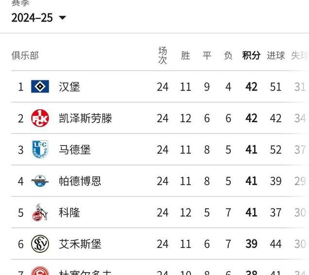 汉堡42分第一,凯泽斯劳滕42分第二。